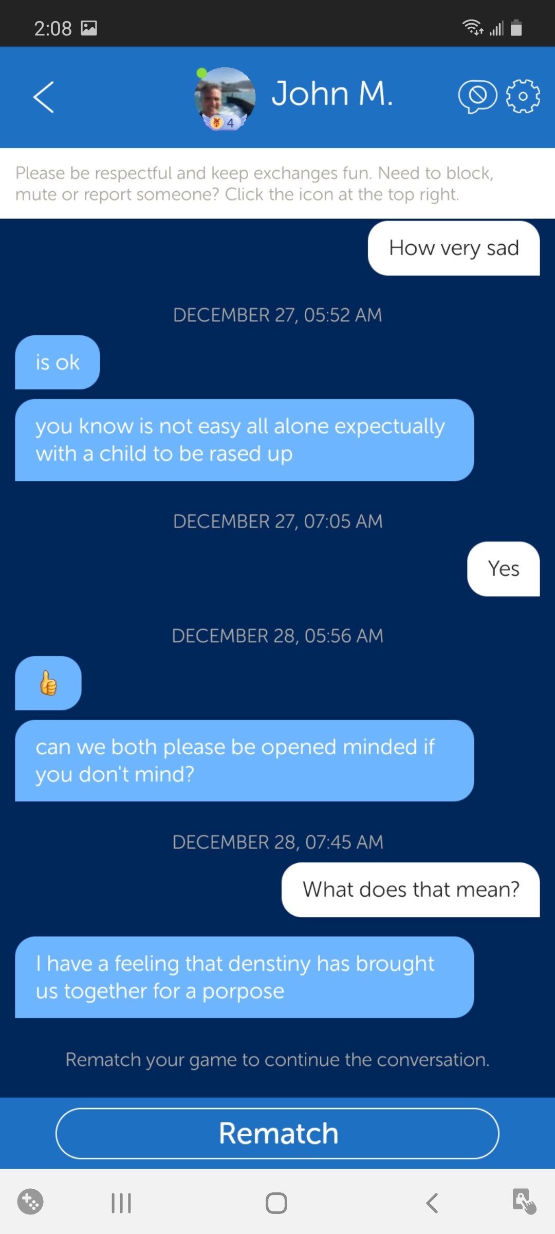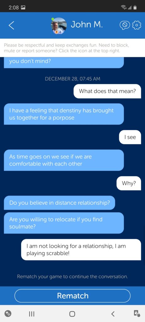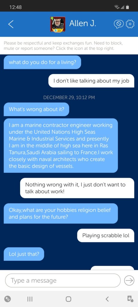Try it on WWF! The Scammy Sammys volunteer their life story – invariably a poor widowed father who doesn’t get on the game often so wants to meet on Google Hangouts. This disclosure of information is intended to generate a sense of reciprocity and intimacy yet comes uninvited! When you do not offer a similar level of disclosure, when you say no and enforce a healthy boundary, you will come under attack!